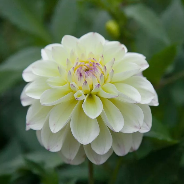 Георгина декоративная Лейк Кери - это великолепное растение с кремовыми цветками, украшенными нежными сиреневыми 'подпалинами' по краю лепестков. Ее стебель достигает высоты до 50 см, а размер цветка составляет 12 см. Листья георгины имеют интересную форму и образуют 7 лепестков. Это растение предпочитает солнечные места и дренированные богатые почвы.