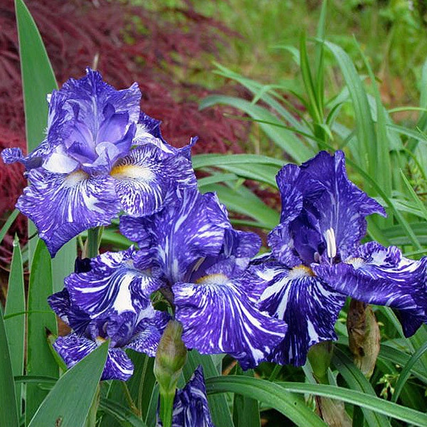 - цветет с июня по июль. Цветок ириса германского Батик отличается сине-лиловыми лепестками с многочисленными белыми брызгами и такой же бородкой. Семенами размножается трудно, более предпочтительный вегетативный способ. В групповых посадках прекрасно сочетается с белыми и синими цветами. Благодаря крупным цветкам и высоким стеблям часто используется на срезку в букеты.