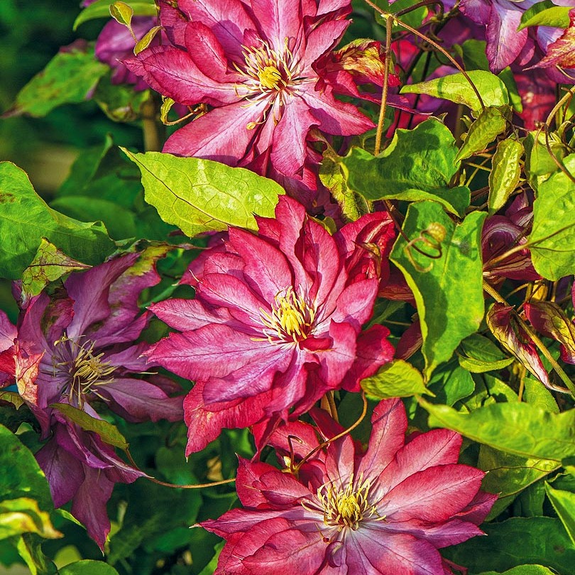 Саженцы клематиса гибридного Kaen предпочитают солнечные, защищенные от ветра места с водопроницаемой, суглинистой, слабощелочной или нейтральной, плодородной почвой. Высаживать растения необходимо рядом с опорами, чтобы длинные лианы (2-2,5 метра) имели за что цепляться. Цветет многолетник обильно в мае — июне. Второе цветение не такое сильное, наблюдается в августе — сентябре. Цветы махровые, диаметром 8-14 см, красно-розового окраса с розовой полоской посередине лепестка. Саженцы клематиса гибридного Kaen широко применяются для вертикального озеленения. Их высаживают вдоль забора, рядом с беседками, у парадного входа и террас.