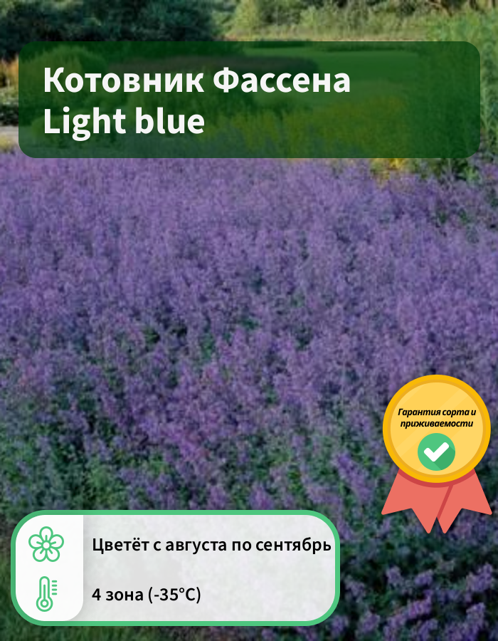 Саженцы котовника Фассена Light blue лучше всего развиваются и обильно цветут на солнце. Но растения переносят и легкую полутень. Сорт устойчив к засухе, даже в особенно жаркие сезоны полив нужен умеренный. Высота многолетника небольшая, примерно 20-30 см. Опушенные стебли скрываются под широкими зелеными листьями. Обильное цветение наблюдается с июня до сентября. Цветочки собираются в колосовидные соцветия сиренево-голубого цвета. На протяжении всего цветения от них исходит яркий мятный аромат. Саженцы котовника Фассена Light blue чаще всего применяют в смешанных цветниках и для бордюров.
