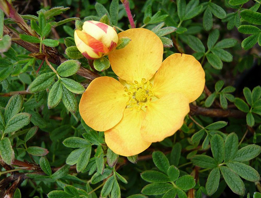 Саженцы лапчатки кустарниковой Танжерин (Tangerine) – достаточно компактный сорт. Максимальная высота этого растения – 60 сантиметров. Внешний облик крупномера радует взор – густая сочно-зеленая крона усыпана цветами, оттенки которых варьируются от золотисто-желтых до медно-оранжевых. Кустарник капризен: требуется регулярный полив, особенно в засушливые периоды; субстрат должен быть богатым, периодически крупномер рекомендуется удобрять; весной растение нужно обрезать – удалять старые побеги. При соблюдении этих правил лапчатка будет радовать пышным цветением с начала лета до заморозков.