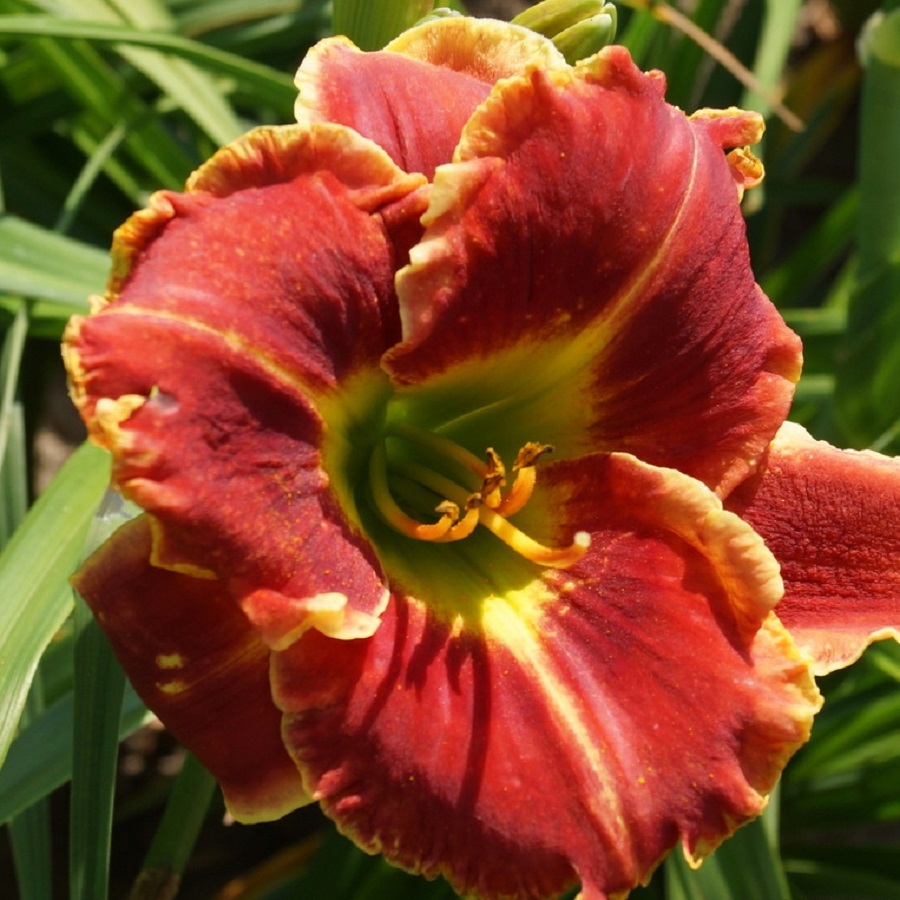 Окраска цветка : Ярко-красная с зелёным горлом и тонкой гофрированной золотистой каймой