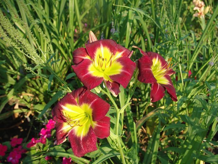 • Окраска цветка : Тёмно-бордовая с жёлтым горлом