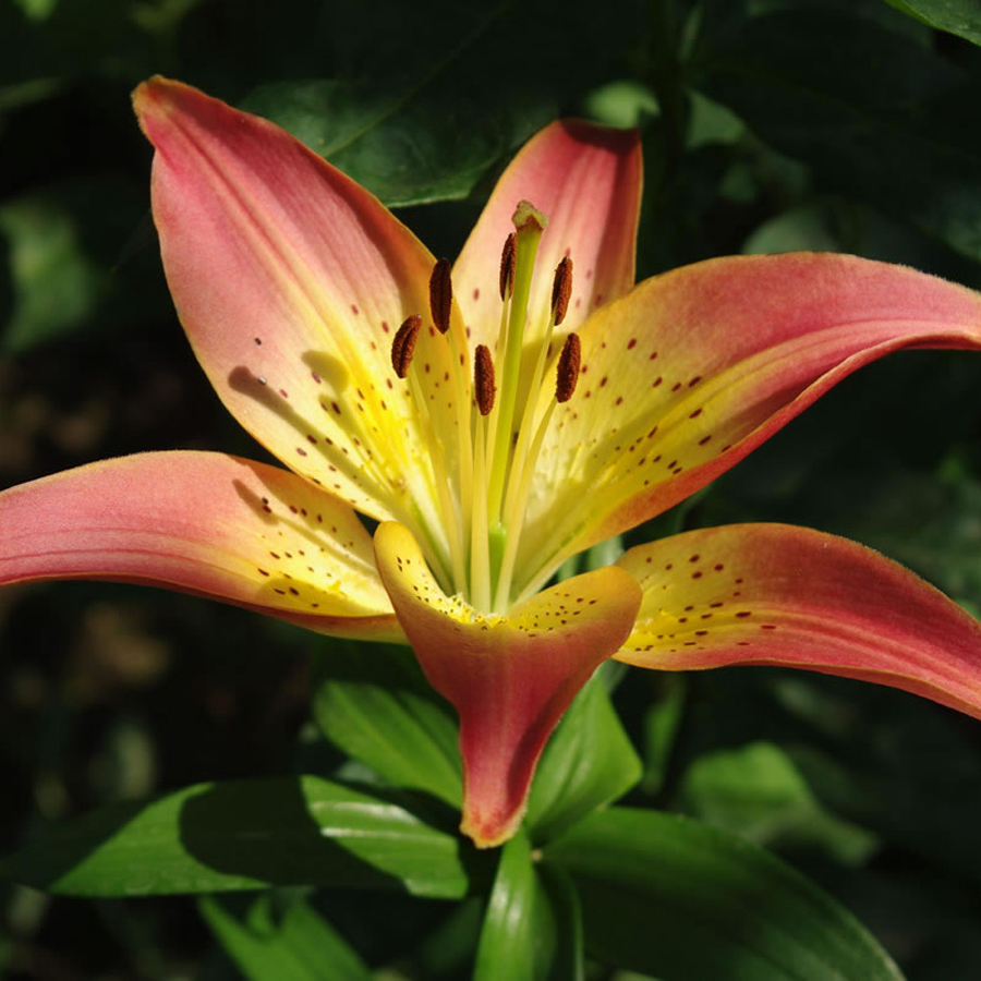 Цветки, раскрывающиеся с июня по июль, удивляют экзотической двухцветной окраской. Лепестки с розово-оранжевыми краями ближе к центру приобретают насыщенный лимонно-желтый оттенок с небольшим крапом вишневого цвета. Цветки раскрываются по очереди, и цветение продолжается длительное время.