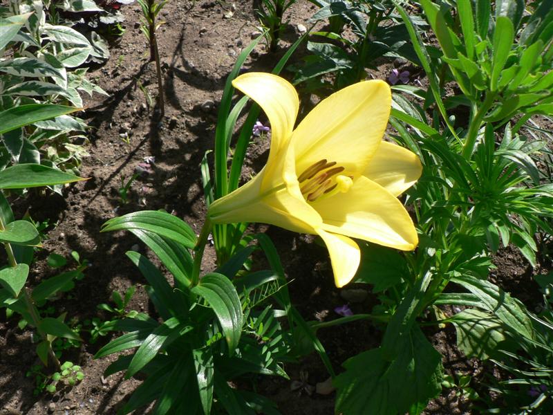 Цветет в июле-сентябре, достаточно продолжительное время. Этот крупный цветок трубчатой формы имеет солнечную лимонно-желтую окраску без вкраплений. При длительном пребывании на ярком солнце выгорает до белого. Эффектно смотрится на фоне насыщенной зеленой листвы. Вырастает не более 100-120 см. Обладает сильно выраженным, насыщенным сладким ароматом.