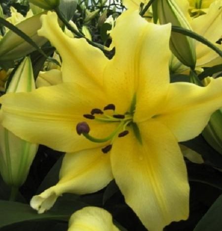 Лилия от-гибрид барута - это великолепное растение с яркими лимонно-жёлтыми цветками, украшенными жёлтой полосой и белой каймой. Ее стебель достигает высоты до 105 см, а размер цветка составляет 25 см. Листья лилии имеют интересную форму, что делает это растение еще более привлекательным.