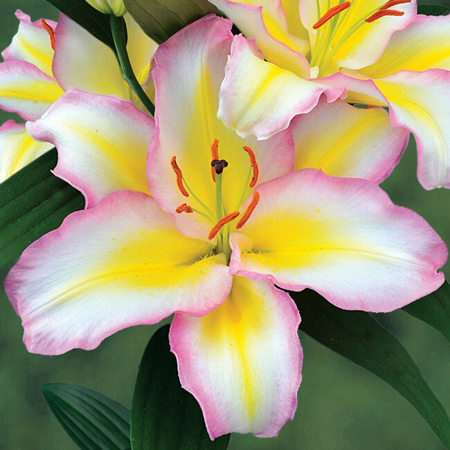 Луковицы лилии восточной Капитан Триколор (Lilum oriental Captain Tricolor) — решение для любителей пастельных тонов и необычных сочетаний. Это высокое растение, до 120 см в длину, популярное для украшения клумб и выращивания под срезку. С уходом за ним справится даже новичок: кусты отлично переносят жару и морозы, легко остаются зимовать в открытом грунте, под укрытием. В середине и в конце лета начинают распускаться бутоны — они достигают 18–20 см каждый и появляются в больших количествах на всех цветоносах. Цветы сразу привлекают внимание необычным окрасом и ярким ароматом. Они белые, с волнистой малиновой каймой и желтой продольной полосой в центре. Образ дополняют контрастные темные пыльники.