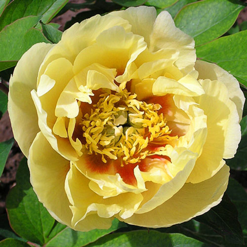 Рассада пиона ИТО Бордер Чарм (Border Charm) без сомнений, самый элегантный сорт из желтых гибридов. Полумахровые цветки с красными основаниями сразу обращают на себя внимание. Диаметр соцветий 16 см. Высота взрослого растения достигает 90 см. ИТО-гибридный сорт вобрал в себя все стойкие качества: высокую морозостойкость и прочность побегов. Цветы долго стоят в срезке. Особенности пиона Бордер Чарм: