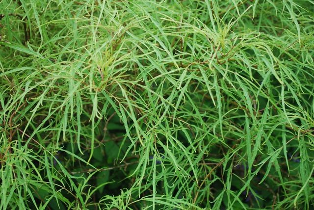 Сорт необычен своей текстурой. Листья его тонкие, узкие, яйцевидной формы, скрученные, по типу травы, зеленого окраса. Цветет бузина в июне-июле белыми цветками, собранными в эффектные соцветия. Плоды созревают в сентябре, черного окраса, съедобные.